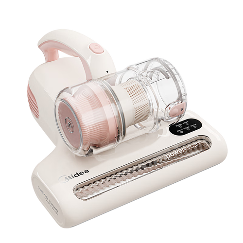美的除螨仪采用粉白渐变配色,机身线条圆润精致,体积小巧(约 32cm 长),可轻松伸入床底、沙发缝隙等狭窄区域。手柄处配备智能屏显,实时显示工作模式(强力 / 轻柔)、剩余电量,避免清洁中途断电,尤其适合记性较差的用户。