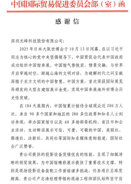 世博会项目,光峰科技收到中国贸促会发来的感谢信