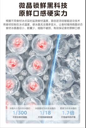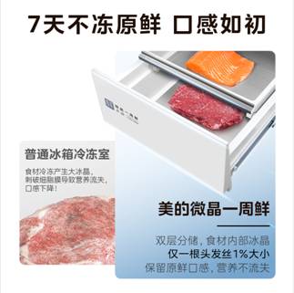 上了一天班回家做饭先要等肉化冻,热水解冻、微波炉解冻口感流失,这个痛点困扰了用户许多年。美的冰箱洞察这一用户需求,2018年行业首发微晶一周鲜技术,引领行业第一次实现了肉类口感保鲜的效果。这项技术的核心突破在于对冰晶形态的掌控:通过智能温控系统实时感知食材冰点变化,精准调控冷量输送节奏,最终在食材内部形成尺寸仅为头发丝直径1%大小的微晶颗粒。这种极细微的冰晶结构从物理层面规避了传统冷冻的弊端——既不会刺破肉类食材细胞膜导致营养流失,也不会破坏肌纤维结构造成口感发柴,真正实现了“在保鲜中锁鲜”的效果。