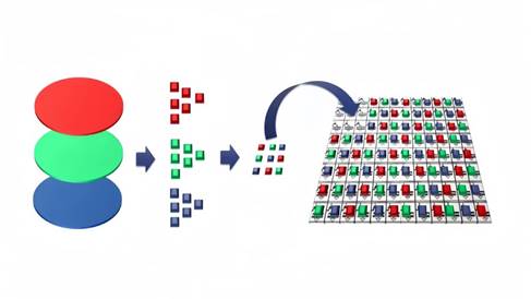 要显示图像,除了光源,还需要有产生图像的调制器。调制器简单来讲,就是非常微小的像素开关阵列。通过百万个像素开关的开和关,就可以拼成图像,而图像的连续运动,就是视频。
