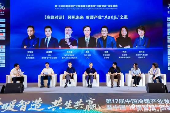 主题峰会的最后议程是以“预见未来‘冷暖产业 共生共赢’之道”为主题的高峰对话。对话由清华大学长聘副教授王宝龙主持,海立电器CTO周易、芬尼能源总经理张靖、海尔智慧楼宇解决方案研究院院长朱连富、英华特董事兼副总经理何利、海信空气事业部品牌总监杨祥玺、天加商用事业中心总经理赵凌骁参加了本次对话。7位嘉宾围绕“破局共生”“出海机遇”“AI 变革”“预见未来”四个关键词对冷暖产业的未来发展进行了深入探讨和交流。