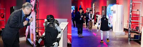 红顶奖艺术展策展人、浮云艺术创始合伙人CEO方明与机器人智源灵犀X2,一同对艺术大展进行导览