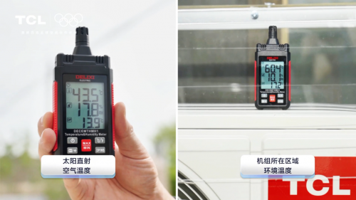 数据显示,太阳直射处空气温度达到43.5℃,机组附近环境温度更是高达60.4℃。即便如此,TCL小蓝翼C7新风空调仍可在测试人员的语音指令下,实现迅速响应,平稳启动,快速制冷,展现出应对极端高温的优异性能。