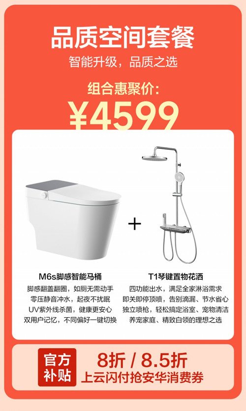 该套餐包含M6s脚感智能马桶与T1琴键置物花洒,聚焦静音、杀菌和多功能使用,适合多数家庭升级选择。