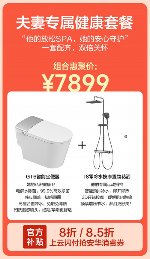 该套餐包含GT6智能马桶与T8零冷水按摩花洒,兼顾女性健康防护与男性舒适放松,主打健康除菌与舒适沐浴体验,贴心守护每一刻。