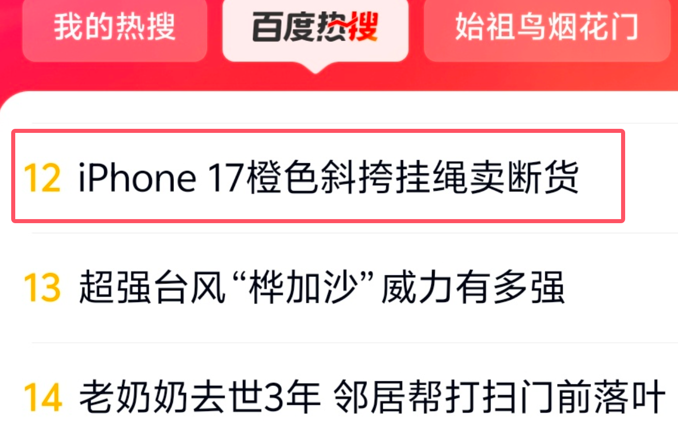 家电消费网9月22日讯 今天,“iPhone 17橙色斜跨挂绳卖断货”冲上百度热搜。