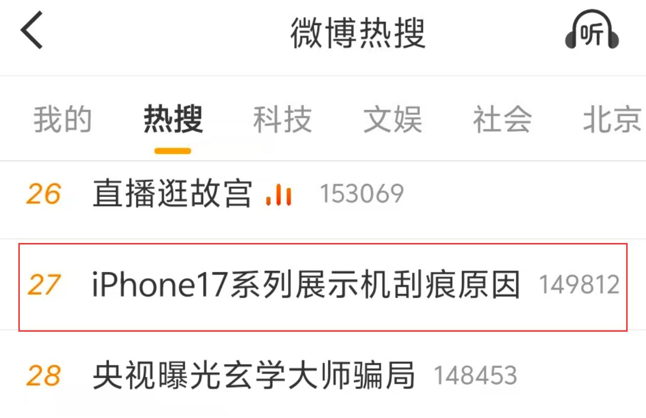 家电消费网9月29日讯 今天,“iPhone17系列展示机刮痕原因”冲上微博热搜。