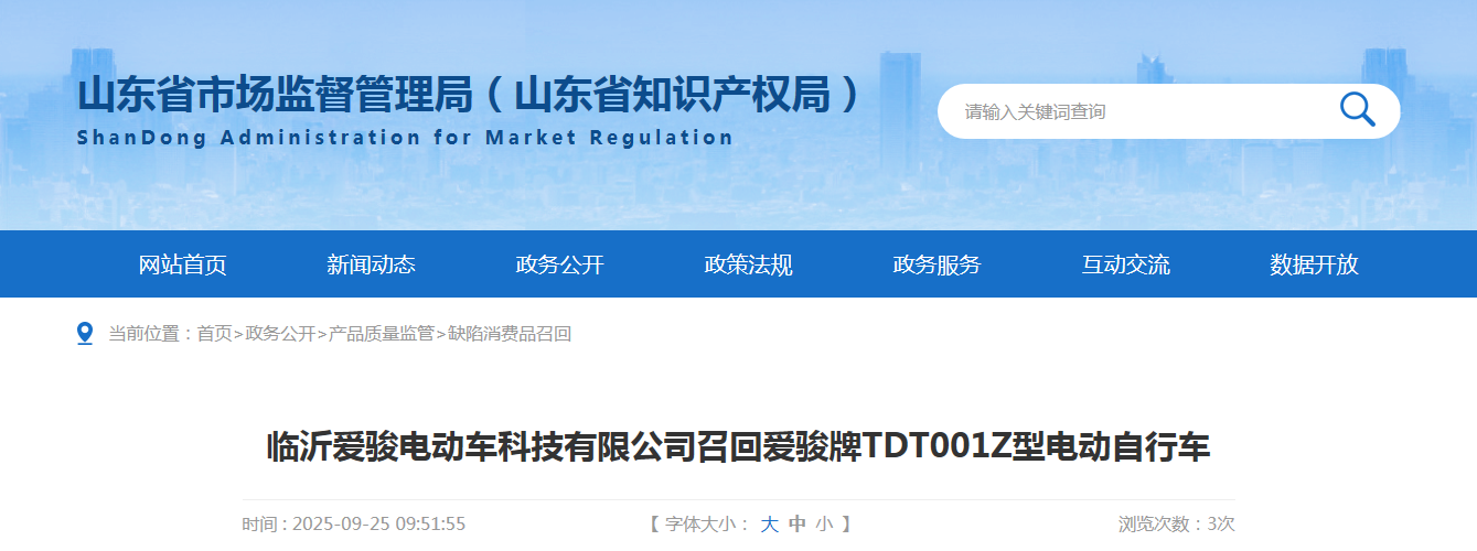 导读: 家电消费网9月30日讯 昨天,山东爱骏电动车科技有限公司按照《消费品召回管理暂行规定》的要求,主动向山东省市场监督管理局报告了召回计划,将自即日起,召回2024年7月10日制造的爱骏牌TDT001Z型电动自行车...