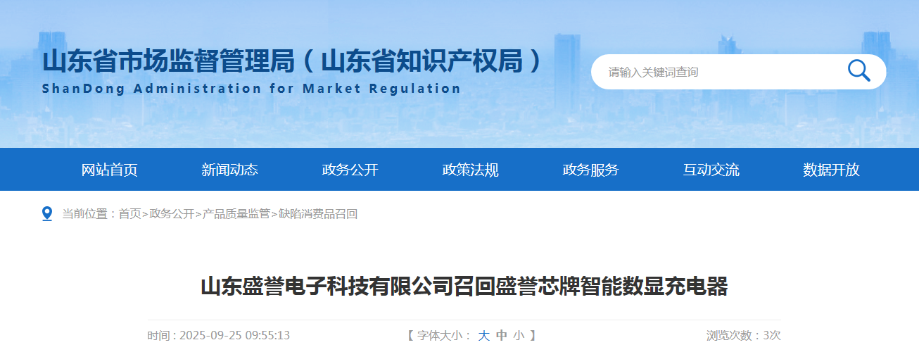 家电消费网9月30日讯 昨天,山东盛誉电子科技有限公司按照《消费品召回管理暂行规定》的要求,主动向山东省市场监督管理局报告了召回计划,将自即日起,召回2024年5月1日至2024年7月31日期间制造的盛誉芯牌60V20Ah、60V32Ah型号智能数显充电器,涉及数量为200台。