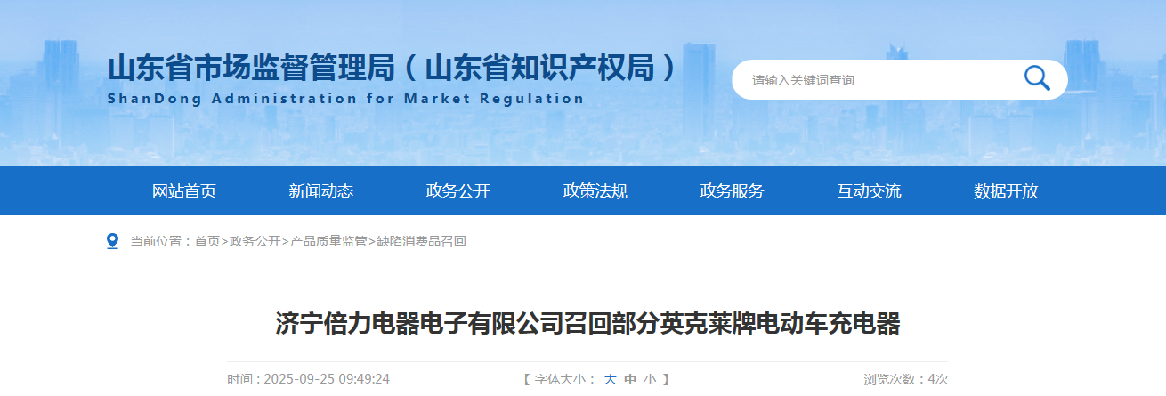家电消费网10月6日讯 昨天,山东倍力电器电子有限公司受缺陷调查影响按照《消费品召回管理暂行规定》的要求,主动向山东省市场监督管理局报告了召回计划,将自即日起,召回2023年6月5日制造的部分英克莱牌型号DZQS602001-C 电动车充电器,涉及数量为20个。