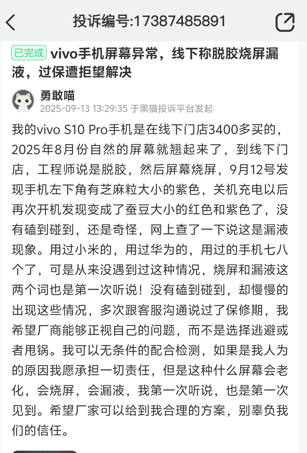 家电消费网10月10日讯 昨天,有消费者投诉称,其花费3400多元购买的vivo S10 Pro手机在今年8月屏幕突然翘起来。vivo门店人员说是脱胶。
