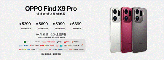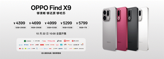 Find X9系列4399元起售,10月22日正式开售;Find X9 Pro卫星通信版11月开售,并将率先支持eSIM。OPPO与哈苏联合打造的哈苏专业影像套装售价1699元。(温丽雅)