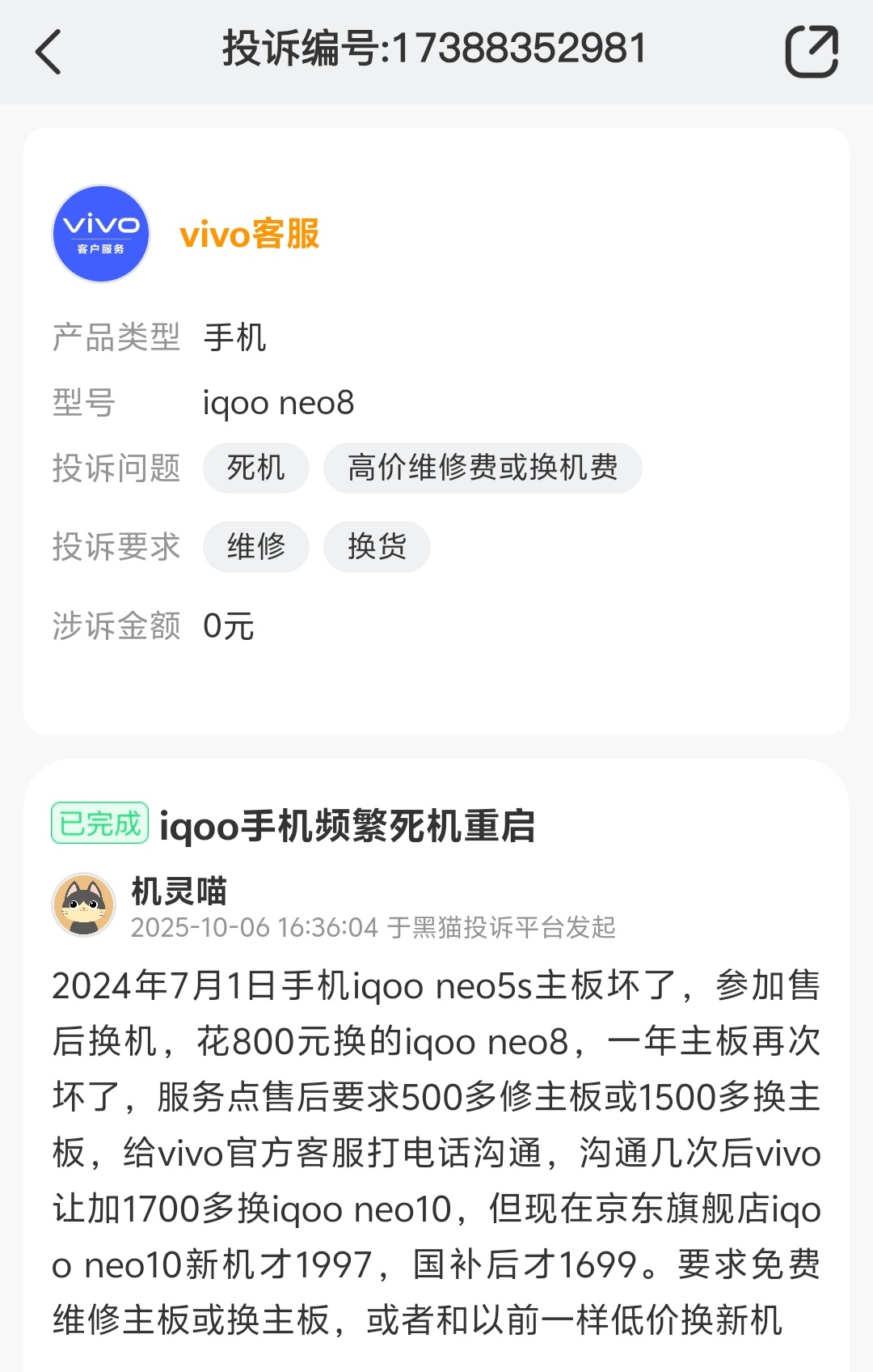 家电消费网11月2日讯 昨天,有消费者投诉称,其于2024年7月1日购买的iqoo neo5s手机主板坏了,vivo售后让再花800元换了iqoo neo8。没想到,iqoo neo8使用一年主板也坏了,服务点售后要求该消费者再交500多元修主板或再交1500多元换主板。和vivo官方客服打电话沟通,最终给出的解决方案是vivo让加1700多元换iqoo neo10。