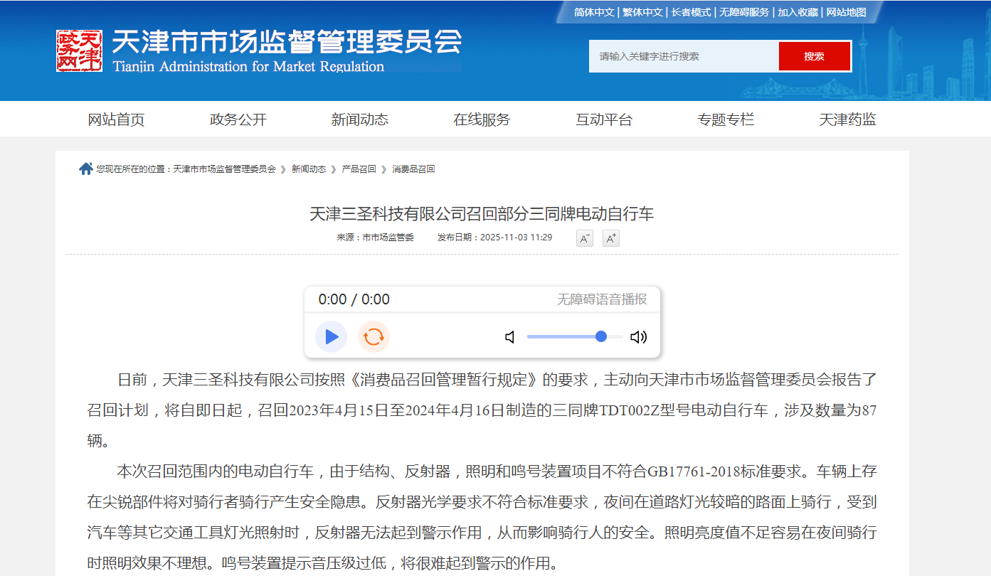 家电消费网11月5日讯 昨天,天津三圣科技有限公司按照《消费品召回管理暂行规定》的要求,主动向天津市市场监督管理委员会报告了召回计划,将自即日起,召回2023年4月15日至2024年4月16日制造的三同牌TDT002Z型号电动自行车,涉及数量为87辆。