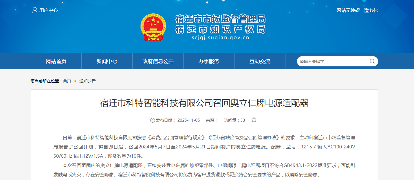 家电消费网11月6日讯 昨天,江苏宿迁市科特智能科技有限公司按照《消费品召回管理暂行规定》《江苏省缺陷消费品召回管理办法》的要求,主动向宿迁市市场监督管理局报告了召回计划,将自即日起,召回2024年5月7日至2024年5月21日期间制造的奥立仁牌电源适配器,型号:1215/输入AC100-240V 50/60Hz输出12V/1.5A,涉及数量为16件。