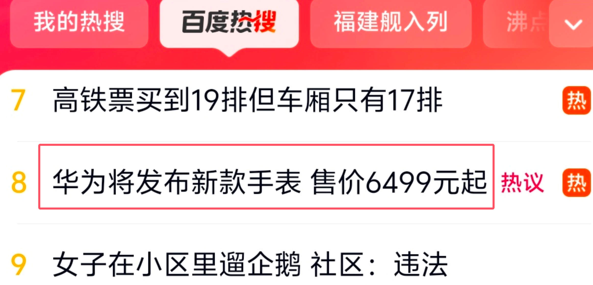 “华为将发布新款手表 售价6499元起”冲上百度热搜 网友:价格遥遥领先