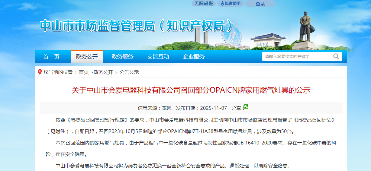 50台OPAICN牌家用燃气灶具被召回 一氧化碳含量超过国标