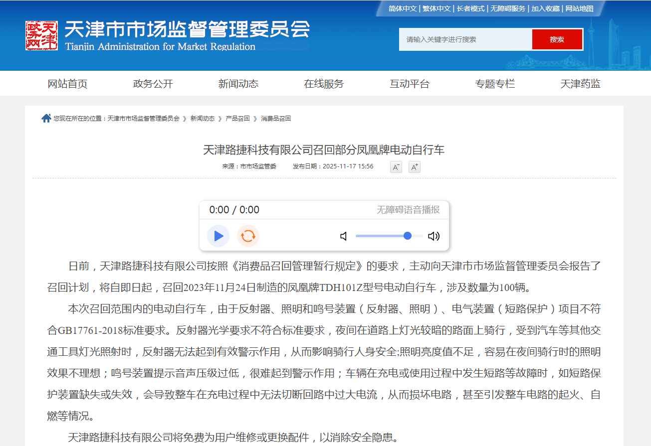 家电消费网11月18日讯 昨天,天津路捷科技有限公司按照《消费品召回管理暂行规定》的要求,主动向天津市市场监督管理委员会报告了召回计划,将自即日起,召回2023年11月24日制造的凤凰牌TDH101Z型号电动自行车,涉及数量为100辆。