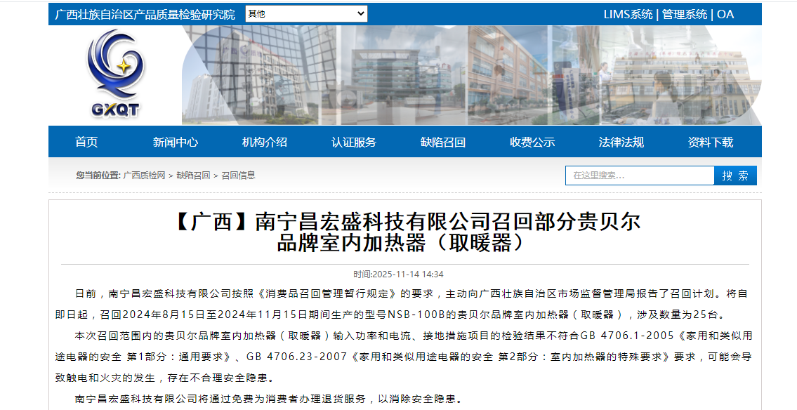家电消费网11月18日讯 昨天,广西南宁昌宏盛科技有限公司按照《消费品召回管理暂行规定》的要求,主动向广西壮族自治区市场监督管理局报告了召回计划。将自即日起,召回2024年8月15日至2024年11月15日期间生产的型号NSB-100B的贵贝尔品牌室内加热器(取暖器),涉及数量为25台。