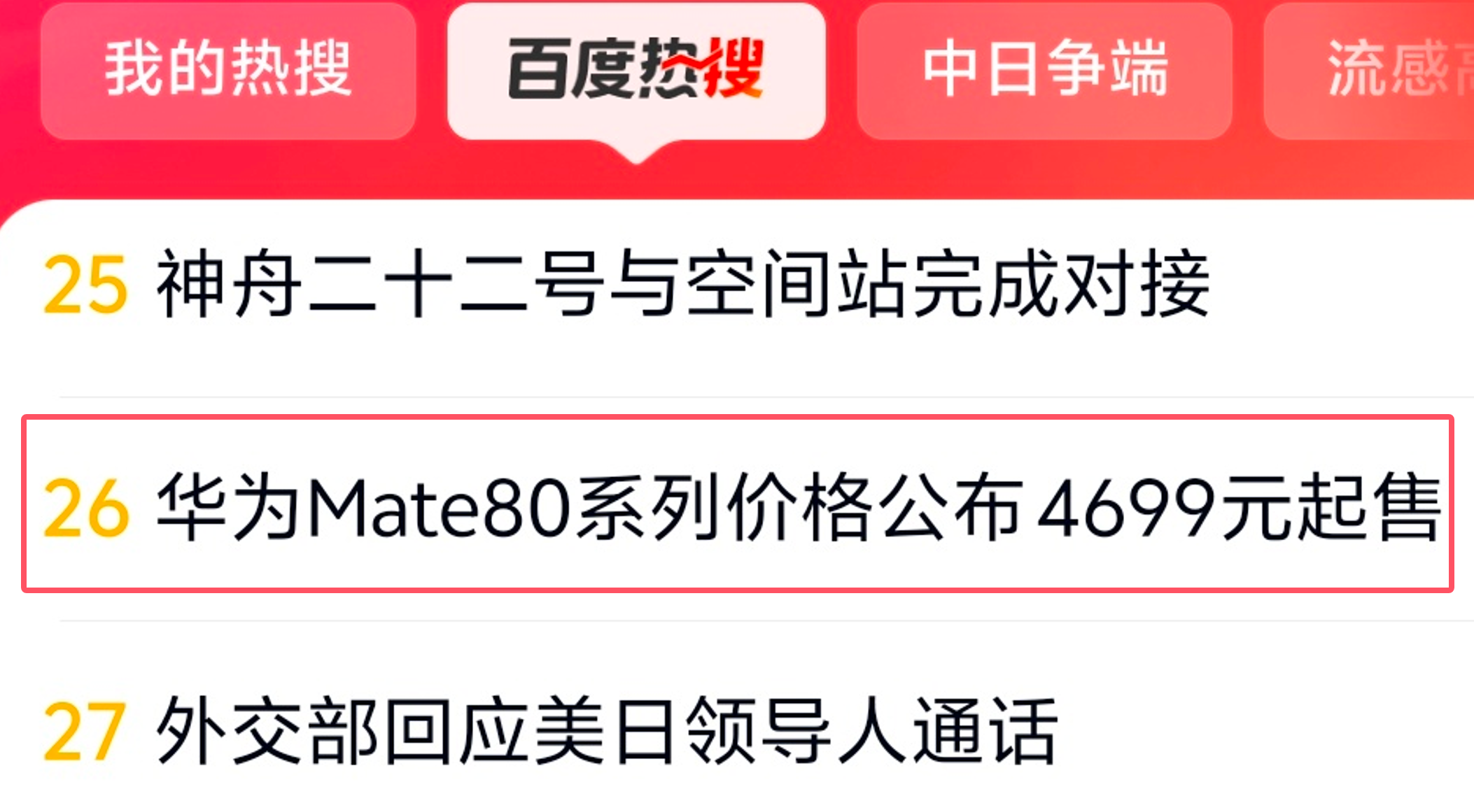 “华为Mate80系列价格公布 4699元起售”冲上百度热搜