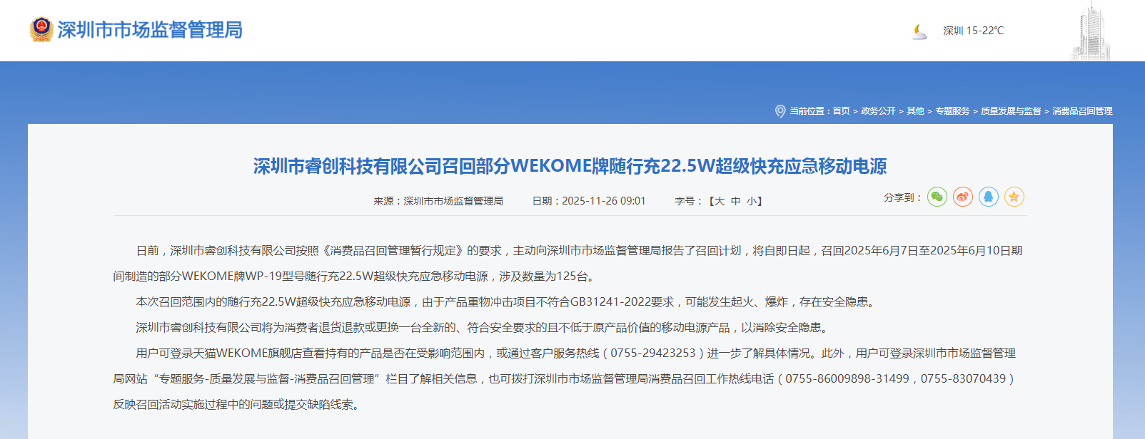 家电消费网11月26日讯 昨天,深圳市睿创科技有限公司按照《消费品召回管理暂行规定》的要求,主动向深圳市市场监督管理局报告了召回计划,将自即日起,召回2025年6月7日至2025年6月10日期间制造的部分WEKOME牌WP-19型号随行充22.5W超级快充应急移动电源,涉及数量为125台。