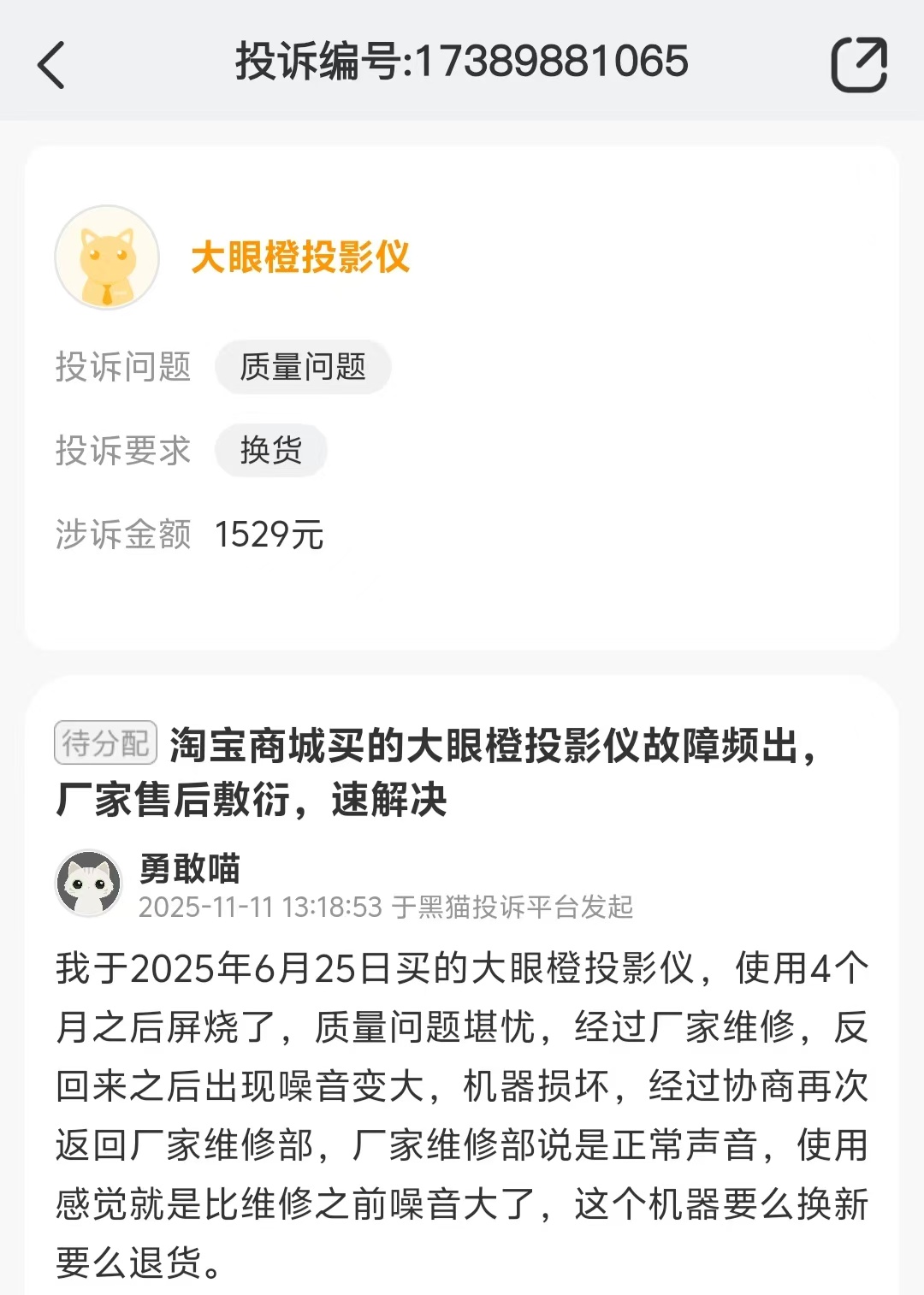 大眼橙投影仪质量问题维修后噪音变大 售后敷衍遭投诉