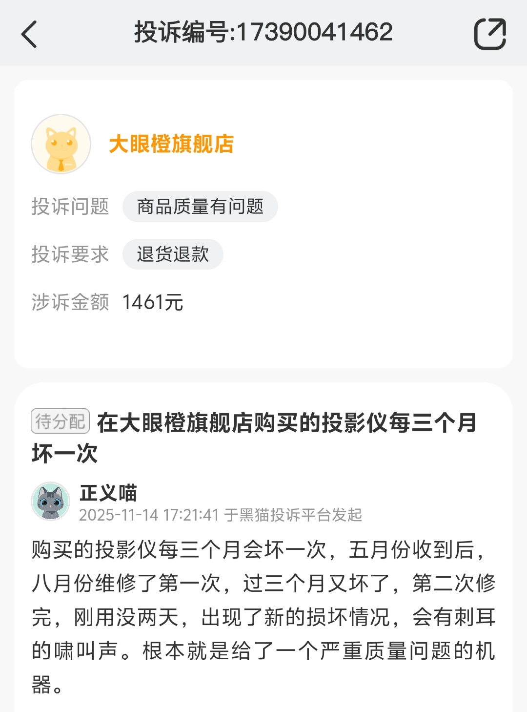 “五月份收到后,八月份维修了第一次,过三个月又坏了,第二次修完,刚用没两天,出现了新的损坏情况,会有刺耳的啸叫声。”该消费者认为,大眼橙投影仪有严重质量问题。