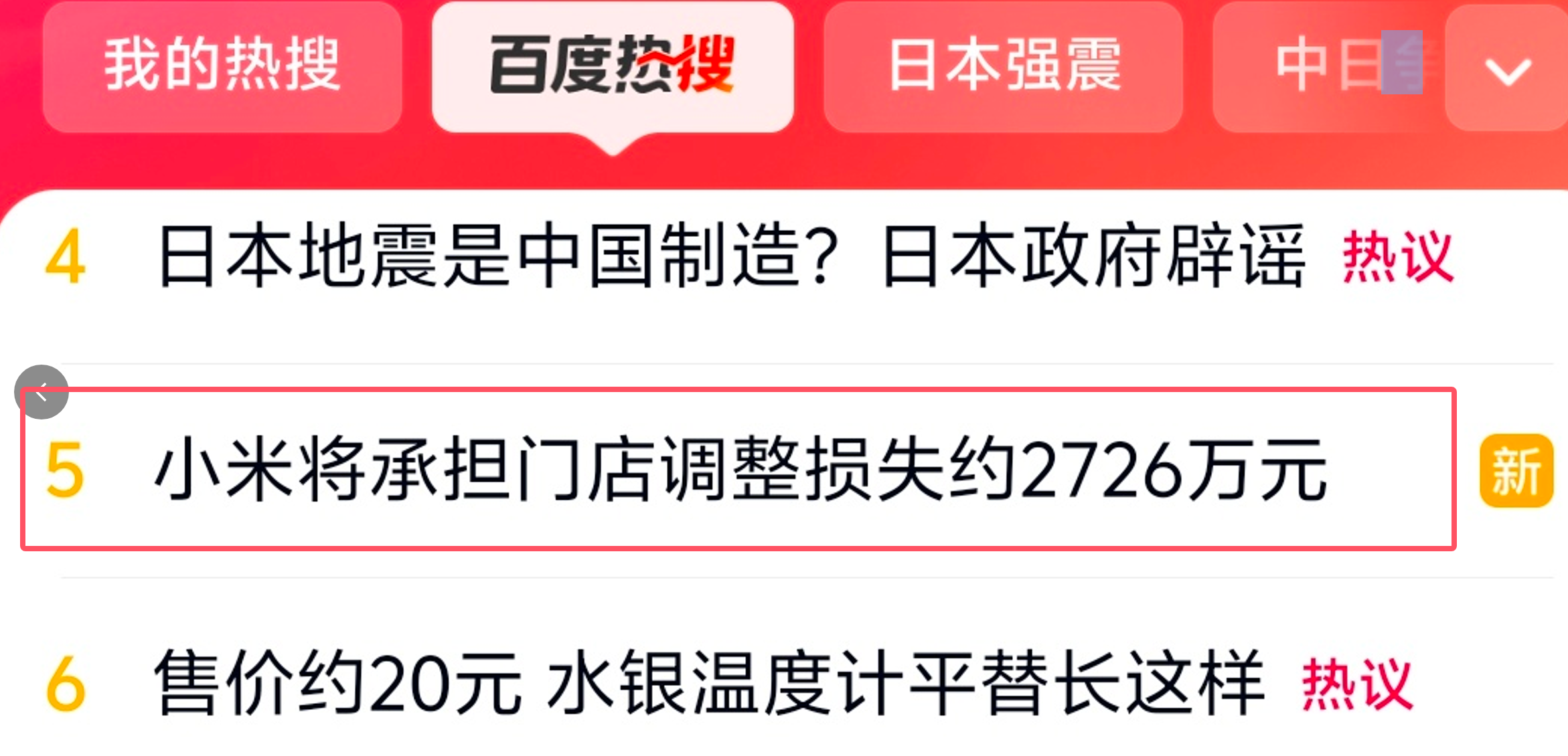 “小米将承担门店调整损失约2726万元”冲上百度热搜