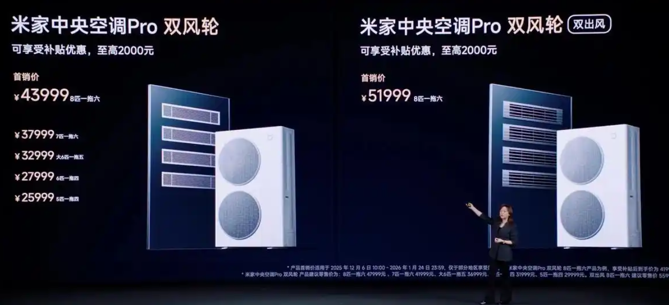 家电消费网12月26日讯 昨日晚间,在小米×徕卡影像战略合作升级暨小米17 Ultra新品发布会上,小米还发布了米家中央空调Pro系列“双风轮”新品,包含标准版和双出风版本,提供5匹、6匹、大6匹、7匹、8匹多种型号,标配智能控制屏,25999元起售。