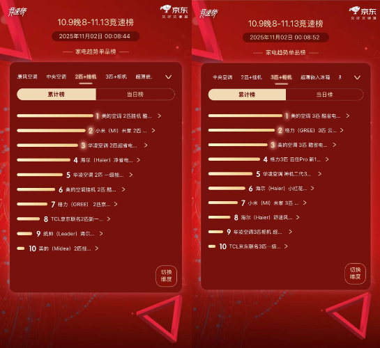 2025年双十一52小时开门红战绩揭晓,家电品类在第四批 690 亿元国补资金的撬动下延续主力地位,而空调赛道的竞争态势尤为值得关注——美的空调以全渠道强势表现脱颖而出,拿下淘系全站空调品牌TOP1、抖音商城空调品牌TOP1,在京东开门红中美的空调还实现中央空调成交排名第一、品牌份额第一、单品断层式第一,持续领跑空调市场、酷省电系列表现尤为突出,强势霸榜万单品质空调、2匹+挂机、3匹+柜机、等多个单品榜,酷省电Ulrta系列更是狂销1.4万套。华凌神机二代系列自1月开卖至双十一首战已销售突破100万套,用户满意度更是高达99.6%。
