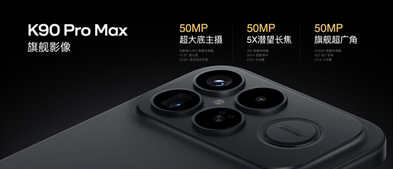 K90 Pro Max 搭载 5000万像素“光影猎人950”超大底主摄,1/1.31英寸超大底传感器具备13.5EV超高动态范围。采用旗舰同款 1G+6P 镜头,逐片镀膜有效降低画面发雾、鬼影、眩光。升级 5000万像素5X光学潜望长焦镜头,支持10倍无损变焦与20倍AI超级变焦,无论是远景建筑还是运动抓拍,都能清晰定格。