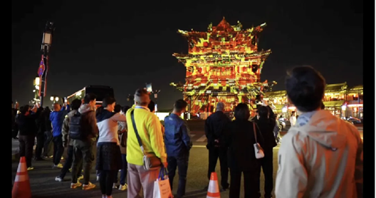 转至户外,鼓楼、太平楼的夜间光影秀则展现了光峰投影在大型建筑载体上的视觉表现力 :光峰工程投影皆应用ALPD半导体激光光源技术,投影过程不会对文物古迹造成光损害,同时色彩丰富的画面与震撼的视觉特效叠加,让历史建筑在夜色中焕发生机,完成了光影艺术的创意表达。