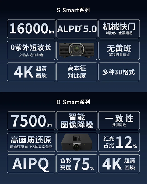 作为本次活动的“重头戏”,光峰专显发布的S Smart与D Smart两款工程投影新品,覆盖6500-16000流明亮度,形成场景需求互补矩阵。两款产品均支持4K超清画质,结合光峰核心技术优势,实现“价格与性能双优”,精准匹配不同场景的投影需求。现场通过专属展项与产品经理专业解读,让新品的技术实力与应用价值直观可见。
