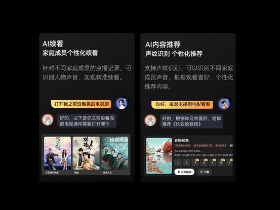 当你正苦恼于你看过的一部电影但却忘记了名字时,AI超级搜索3.0将会精准地告知你是什么。比如你可以问:“程序员送外卖是哪部电影?”智能体会精准地告诉你是《逆行人生》,并且不仅限于模糊搜索。超级搜索3.0的声纹识别技术能为每一个家庭成员提供专属服务:语音直达解决长辈不会用的烦恼,适龄内容推荐保护孩子的使用健康,不同成员拥有专属声纹推荐,记住您家庭的每一个爱好。