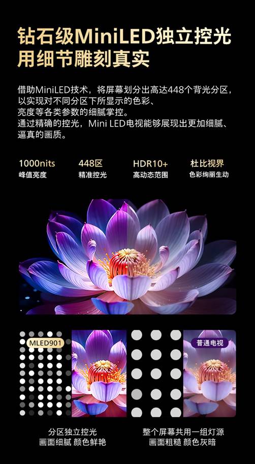 飞利浦100MLED901借助MiniLED技术,能够实现暗场深邃纯粹、亮场通透不刺眼的极致效果,其将屏幕划分出高达448个背光分区,以实现对不同分区下所显示的色彩、亮度等各类参数的细腻掌控。搭配1000尼特高峰值亮度、杜比视界,呈现更细腻、逼真的画面效果。