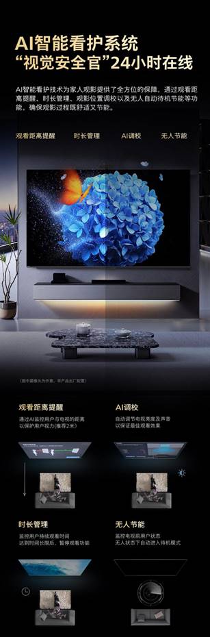AI智能看护技术为家人观影提供了全方位的保障,通过观看距离提醒,监控用户与电视的距离以保护用户视力(推荐2米);时长管理,监控用户持续观看时间,达到时间长限后,暂停观看功能;观影位置调校,自动调节电视亮度及声音,以保证最佳观看效果;无人自动待机节能,无人状态下自动进入待机模式等功能,确保观影过程既舒适又节能。
