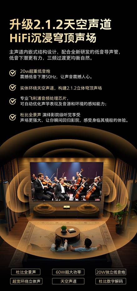 极致的观影体验离不开“声”“画”双绝,飞利浦100MLED901在视觉拉满的同时,升级带来2.1.2天空声道架构,打破传统电视的平面音效局限,为用户带来全方位包裹的立体听觉盛宴。