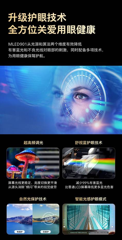 飞利浦100MLED901从光源和算法两个维度,有效降低有害蓝光和不良光线对眼部的刺激,同时配备超高频调光、舒视蓝护眼技术、自然光保护技术、智能光感护眼模式等,为用眼健康保驾护航。