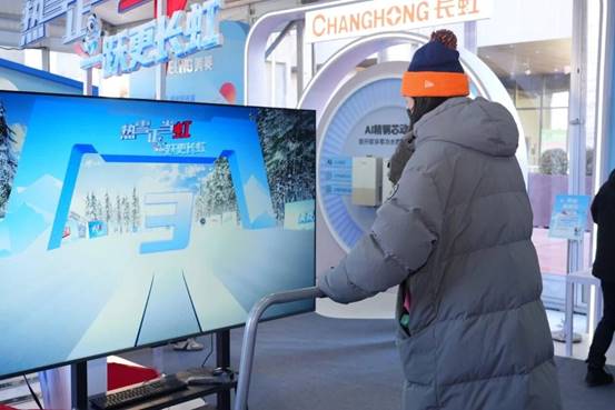 在赛事现场,长虹打造了沉浸式观赛快闪店,携全面满足《百吋电视选购白皮书》8大标准的长虹百吋新品阵列包括100Q10Air、100U7H Mini及85吋Q10T Ultra等AI家电精彩亮相。长虹在现场设置了趣味打卡互动游戏,吸引众多冰雪爱好者参与。在完成任务、获取精美礼品的同时,他们也深度体验了长虹电视以卓越画质与沉浸音效还原赛场的震撼,仿佛身临其境。