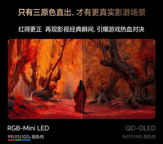 如果说芯片解决的是“看的准”、屏幕解决“看的清”,那么控光则决定了100寸电视是否“看的真”。不同于过去单纯追求背光数量,如今行业已经迈入了追求控光“精度”的全新维度。在这点上,作为RGB-Mini LED电视的开创者和引领者,海信100寸电视带来的是从“单一控光”到“光色同控”的全面提升,RGB-Mini LED电视的每个微小背光单元,都集成了独立高效的红、绿、蓝三原色灯珠,能对每个区域亮度和色彩精准调控。比如用海信E8S Pro看《星际穿越》卡冈图雅黑洞场景时,引力透镜效应产生的奇异光束高亮且色彩绚烂,黑洞本身及周围的宇宙空间保持深邃的黑度,毫无传统大屏的大块色晕和层次模糊。