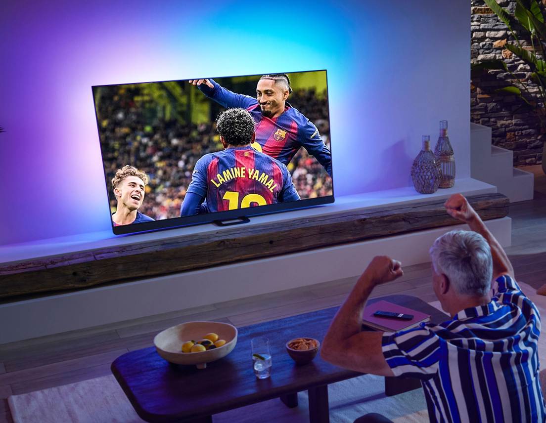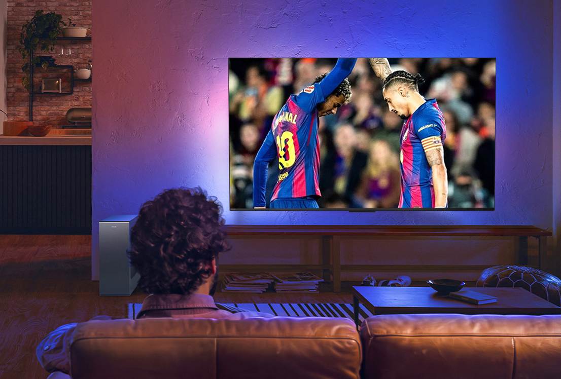 上半场拉菲尼亚突入禁区造点,飞利浦环景光电视同步迸发锐利红光,沿球员突破轨迹在墙面划出流畅光轨,将球场的紧张氛围直接拉进客厅。飞利浦独家环景光技术采用第十代Ambilight算法,LED背光与画面实时同步,让色彩溢出屏幕,带来“跟随电视”、“跟随音乐”、“跟随国旗”等模式,提供全新视觉体验,每次突破、每粒进球、每次欢呼,都化作环绕式光影体验,仿佛亲临赛场,见证巴萨2025红蓝收官的热血与荣光。