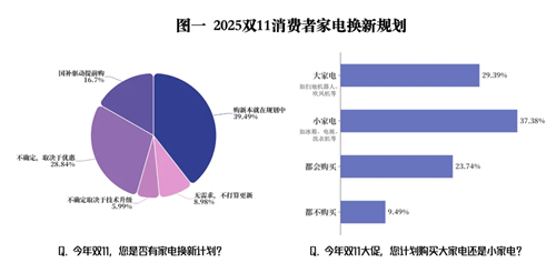 从消费品类看,小家电在本轮“双11”吸引力更强。在有家电购置计划的消费者中,37.38%计划入手小家电,29.39%瞄准大家电,23.74%表示“都会购买”,不同品类家电都有市场空间,消费者选择更丰富。