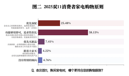 本次调研还勾勒出当前家电消费的两大核心群体。“务实族”占比58.13%,坚持“功能够用即可”,追求极致性价比;“顶配族”占比25.48%,认为家电是长周期使用产品,应在预算范围内选配置最好、性能最强的型号。