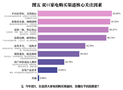尽管消费理念不同,但消费者在选择平台时表现出高度共识。52.69%的受访者将“平台信誉好,买得放心”视为核心考量。价格实惠同样是消费者关注的重点,51.53%的受访者将其作为选择平台的关键因素。