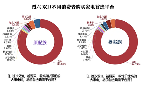 消费者对购买家电综合体验的重视,凸显了京东的优势。调研数据显示,无论是“顶配族”还是“务实族”,都将京东作为首选。83.88%的“顶配族”认可京东作为“家电消费主场”的品质信赖感;84.73%的“务实族”青睐其“补贴直给、型号齐全、服务可靠”。