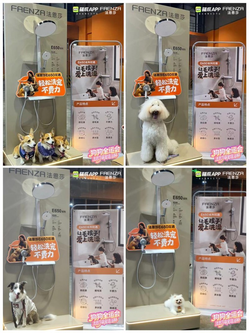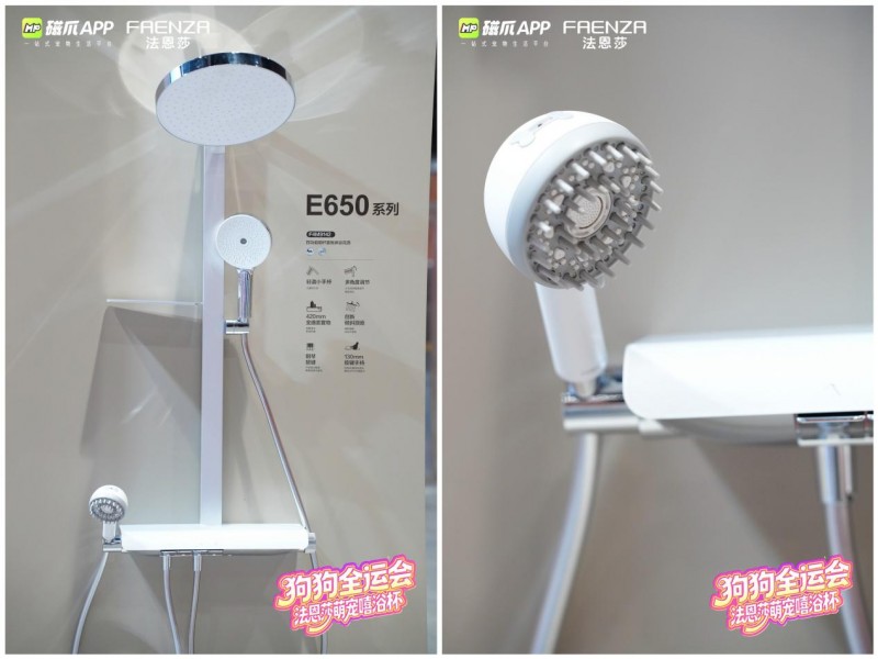 赛场边,法恩莎品牌赞助展位化身赛场焦点,众多宠主携爱宠驻足打卡。展区重磅亮相的E650系列萌宠洗花洒,凭借颠覆性设计与人性化细节,吸引宠主纷纷围观咨询,探索“萌宠洗澡难题的终极解决方案”!
