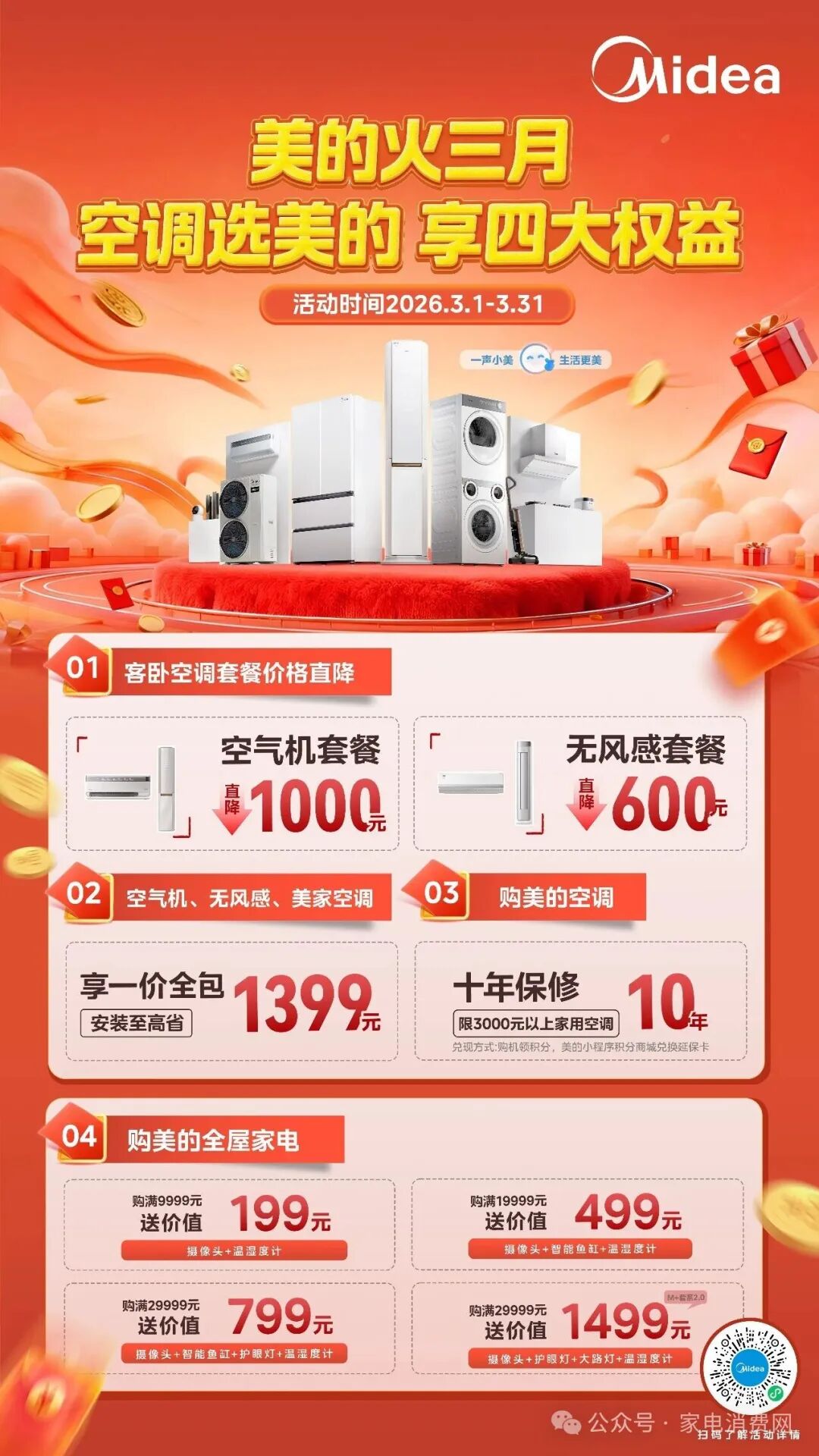 除了“一价全包”的极致省心,美的空调还通过多维度的政策组合拳,试图覆盖用户从购机到售后的全生命周期。在促销力度上,客卧空调套装价格迎来直降,其中空气机柜挂套装直降1000元,无风感柜挂套装直降600元。而在最核心的服务背书上,针对3000元以上的家用空调,用户可通过购机积分在小程序兑换10年原厂延保卡,而家用中央空调全系更是同步实现了延保至10年的硬核承诺。