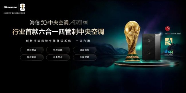 面对这一困扰行业与用户的共性难题,海信5G中央空调Ai家IIPRO交出了惊艳行业的破局答卷——打造行业首款六合一四管制中央空调。它跳出传统设备功能简单叠加的固化思维,以一体化集成设计实现“以一抵六”的革命性突破,将舒适制冷、全屋采暖、中央热水、集成新风、温湿双控、全屋智能六大核心功能,巧妙集成于一套系统之中,从根源上破解设备堆砌、能源浪费的行业痛点。
