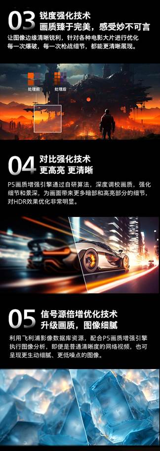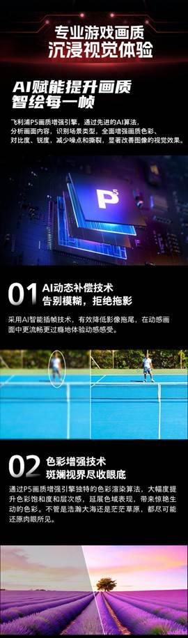 飞利浦P5画质增强引擎,通过先进的AI算法分析画面内容,识别场景类型,全面增强画质色彩对比度、锐度,减少噪点和撕裂,显著改善图像的视觉效果。AI动态补偿技术,采用AI智能插帧技术,有效降低影像拖尾,在动感画面中更流畅更过瘾地体验动感感受;色彩增强技术,通过P5画质增强引擎独特的色彩渲染算法,大幅度提升色彩饱和度和层次感,延展色域表现,带来惊艳生动的色彩,不管是浩瀚大海还是茫茫草原,都尽可能还原肉眼所见;锐度强化技术,让图像边缘清晰锐利,针对各种电影大片进行优化每一次爆破,每一次枪战细节,都能更清晰展现;对比强化技术,P5画质增强引擎通过自研算法,深度调校画质,强化细节和景深,为画面带来更多暗部和高亮部分的细节对HDR效果优化非常明显;信号源倍增优化技术,利用飞利浦影像数据库资源,配合P5画质增强引擎执行图像分析,即便是普通清晰度的网络视频,也可呈现更生动细腻、更低噪点的图像。