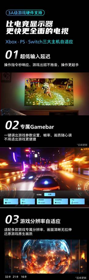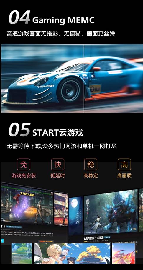 真正的电竞装备,必须能从容驾驭3A大作的重度负载,飞利浦高刷游戏电视7791在硬件配置上做到“满配无短板”,拥有超低输入延迟,操作指令秒响应、游戏出招不拖沓,操作更趁手;专属Gamebar, 一键调出游戏参数设置,帧率、画质随心调,不用退出游戏更便捷;游戏分辨率自适应,适配多款游戏专属分辨率,画面清晰无拉伸,还原游戏原生画质;Gaming MEMC,高速游戏画面无拖影、无模糊,画面更丝滑;START云游戏,无需等待下载,众多热门网游和单机一网打尽,凭借诸多3A级游戏硬件支持让客厅彻底变身专业电竞战场。